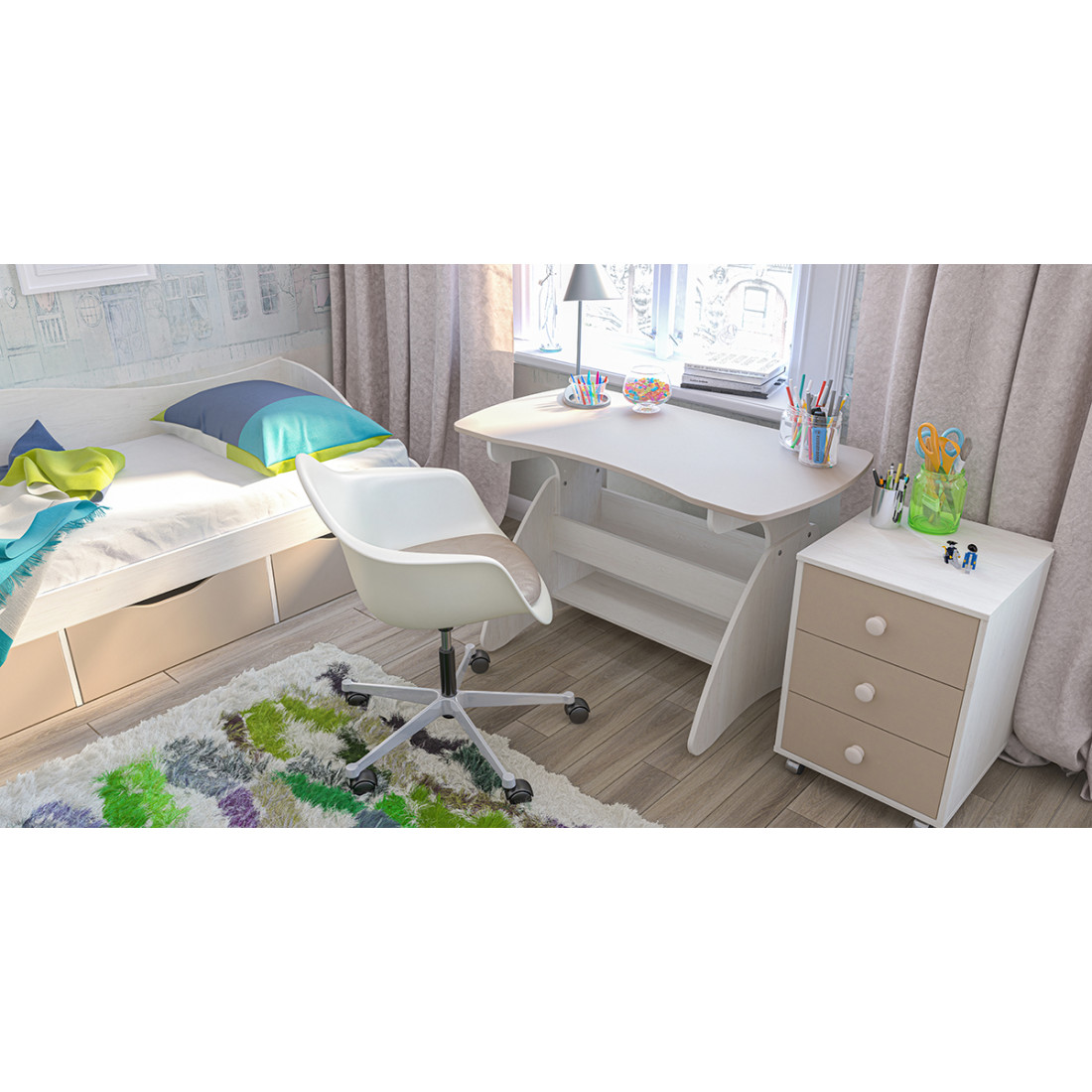 Купить недорогой стол для детской можно отдельно, модель легко комплектуется другими элементами Комби – тумбами, полками, пеналами.