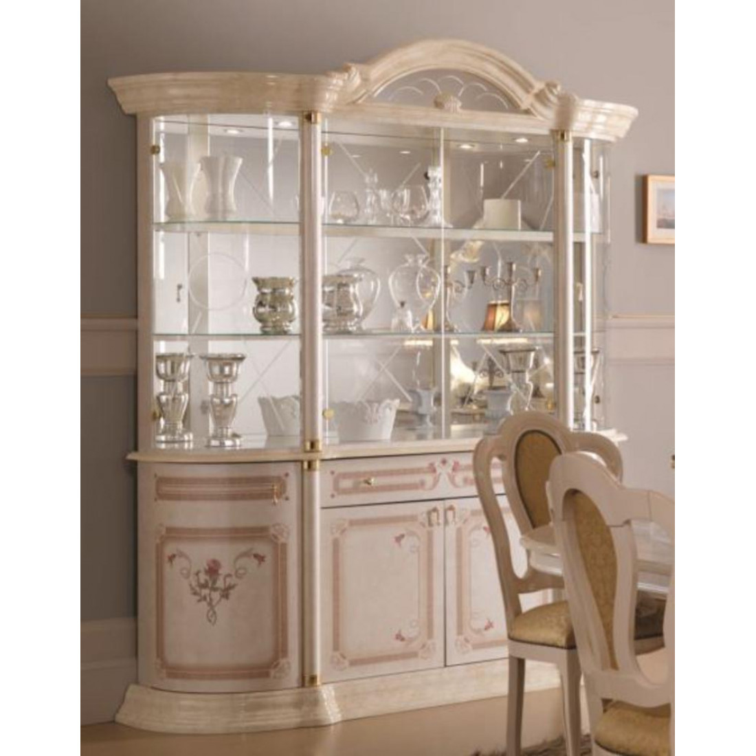 Шкаф-витрина четырехдверный Роза (беж) от фабрики ДИА мебель выполнен в классическом стиле. Бежевый цвет в сочетании с глянцевым покрытием придает мебели элегантности и эстетичности. Золотистая роспись и позолоченные ручки на фасаде придадут атмосферу роскоши в вашей гостиной. Стеклянная витрина поможет сконцентрировать внимание на отдельных элементах вашего декора.