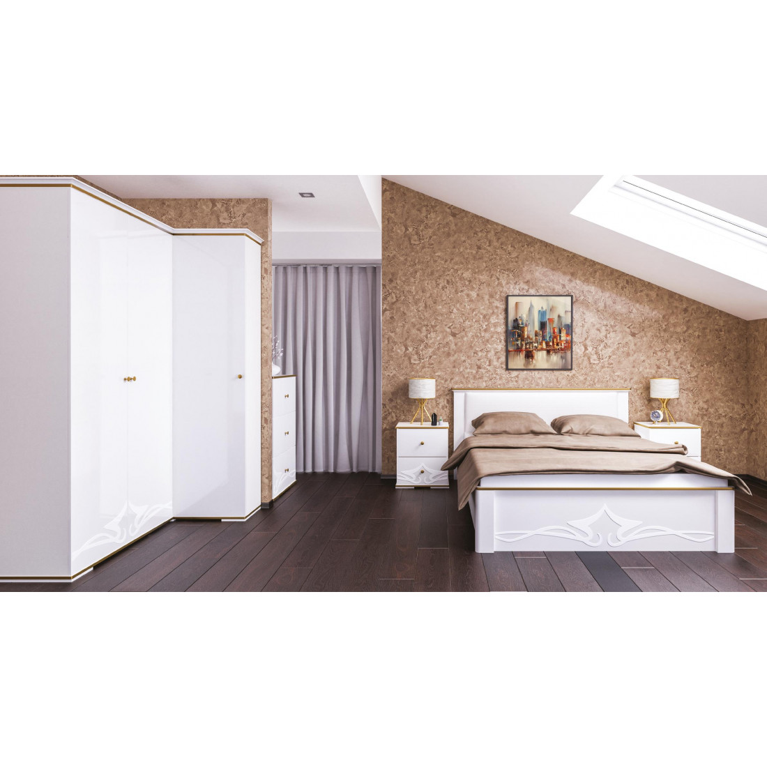 Спальня Либерти композиция 4 с угловым трехдверным шкафом, комодом, двухспальней кроватью и тумбочками.