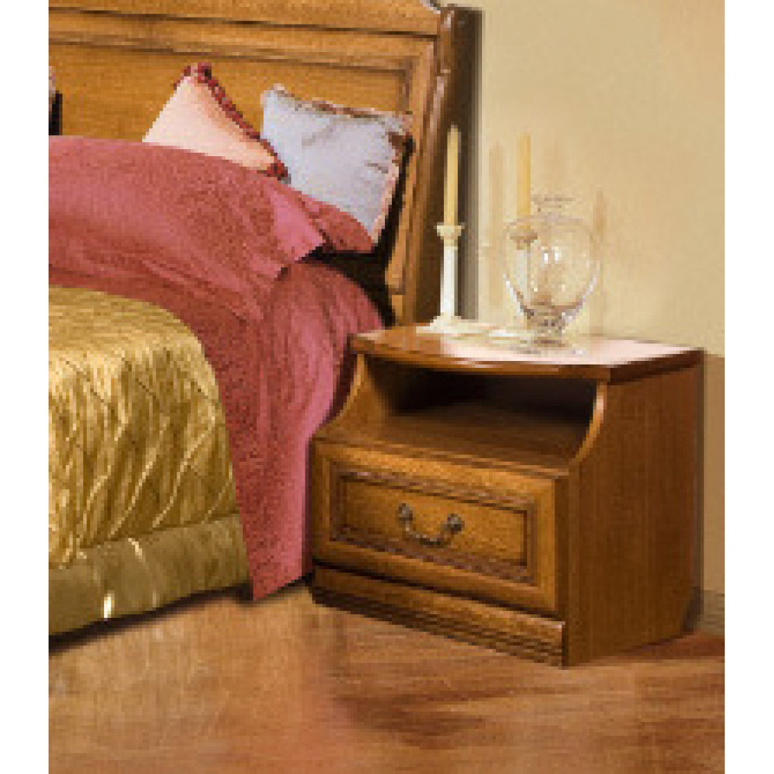 Оригинальная прикроватная тумба из коллекции «Нинель» в цвете табак с патиной предлагает выдвижной ящик и удобное, открытое место для хранения. На столешницу сверху можно поставить ночник или лампу. Красиво оформленный при помощи резьбы ящик дополнен изящной состаренной ручкой. Качественная и долговечная мебель из натурального дерева от белорусских мастеров фабрики «Молодечномебель» отлично дополнит интерьер в различных стилях.